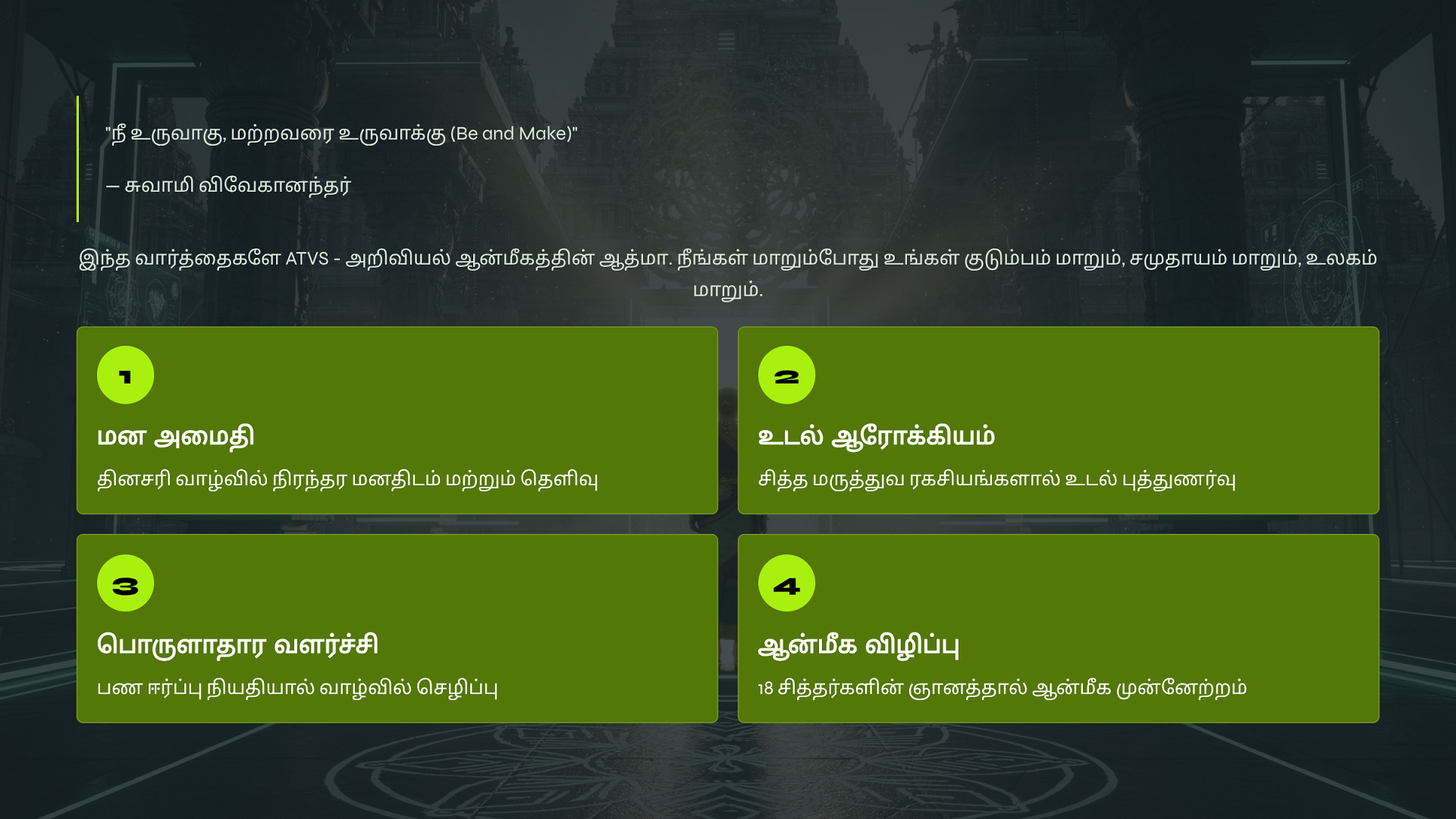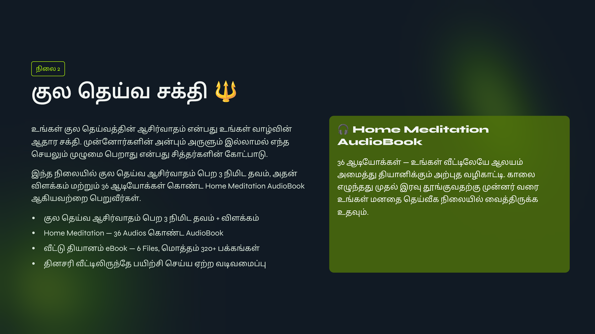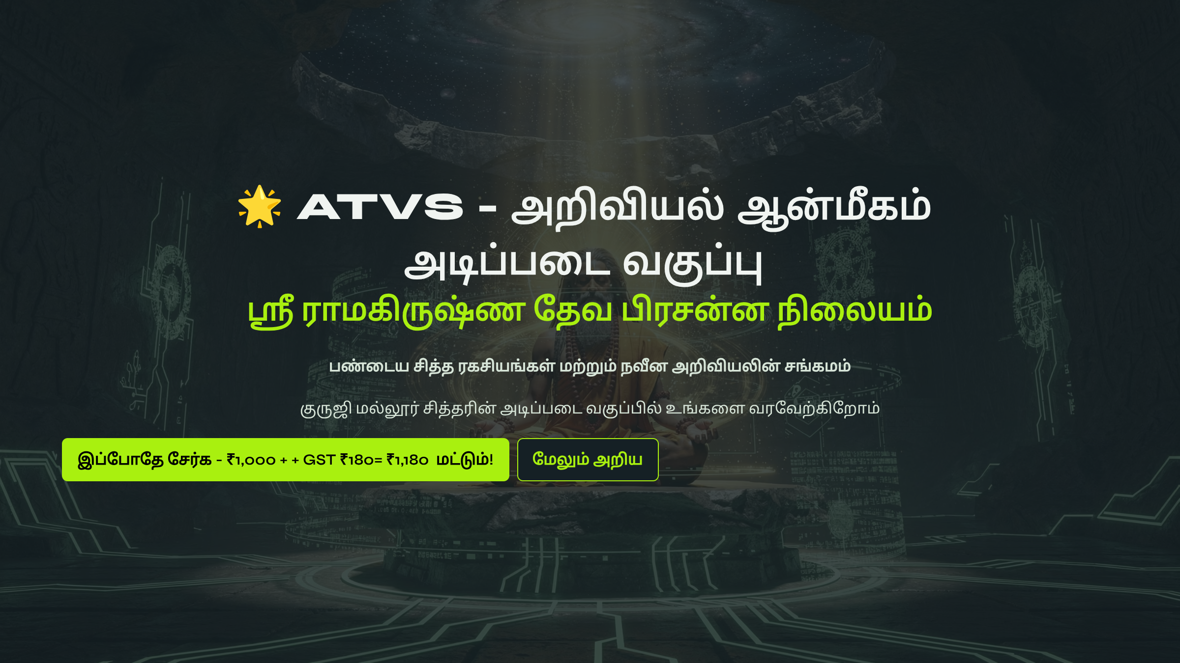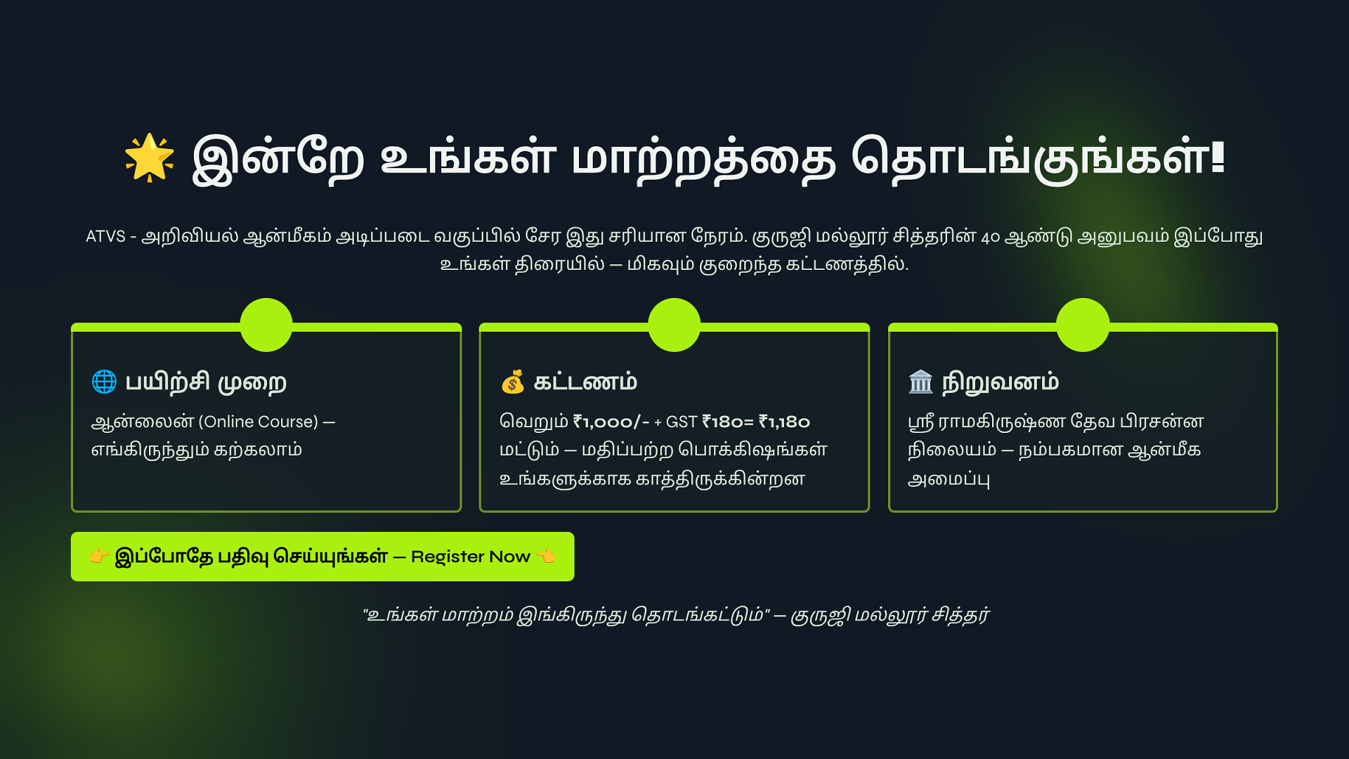 ATVS Community உறுப்பினராக சேர்ந்திருங்கள். உறுப்பினர் கட்டணம் ₹1000 + GST ₹180 = ₹1,180 உங்களுக்கு எங்களது ஆன்லைன் சேவை 1️⃣ குரு அருள் சக்தி, 2️⃣ குல தெய்வ சக்தி, 3️⃣ மூன்று தலைமுறை சக்தி, 4️⃣ அச்சம் தவிர் சக்தி, 5️⃣ பணம் ஈர்ப்பு சக்தி, 6️⃣ ஞான தியான சக்தி, 7️⃣ Atvs Bonus 1: eBooks - 21 - Day Life Clarity & Peace System 8️⃣ Atvs Bonus 2: eBooks - 21 - Spiritual Remides இதை நன்கு பயின்று மாயா & சாயா மங்கல சக்தி பைகள் தயாரித்து விற்பனை செய்து மாதம் 1,00,000 சம்பாதிக்கும் ஆன்மீக தொழில்முனைவோர் திட்டம் தருகிறோம்.