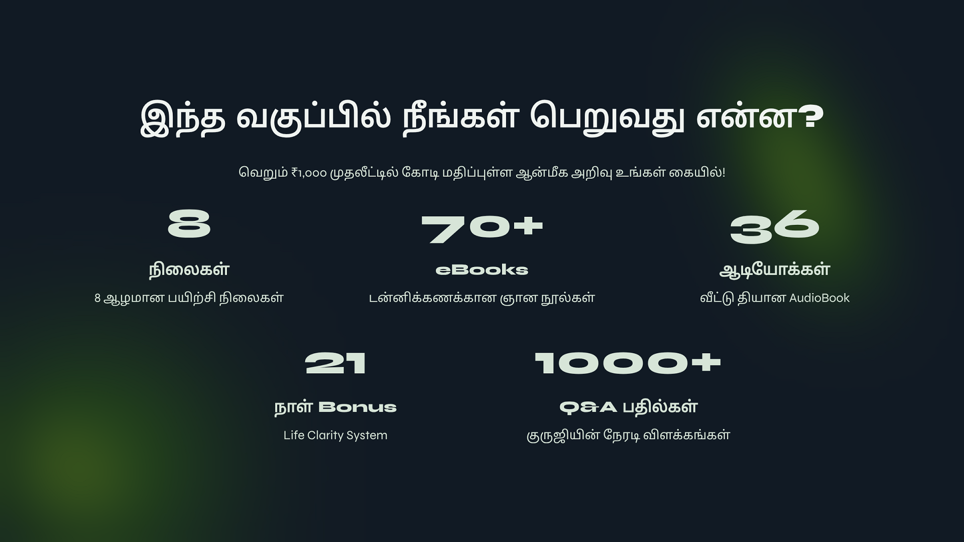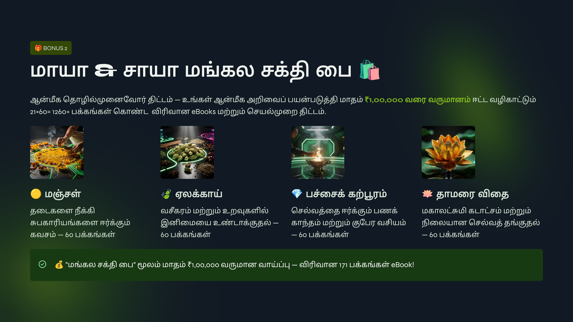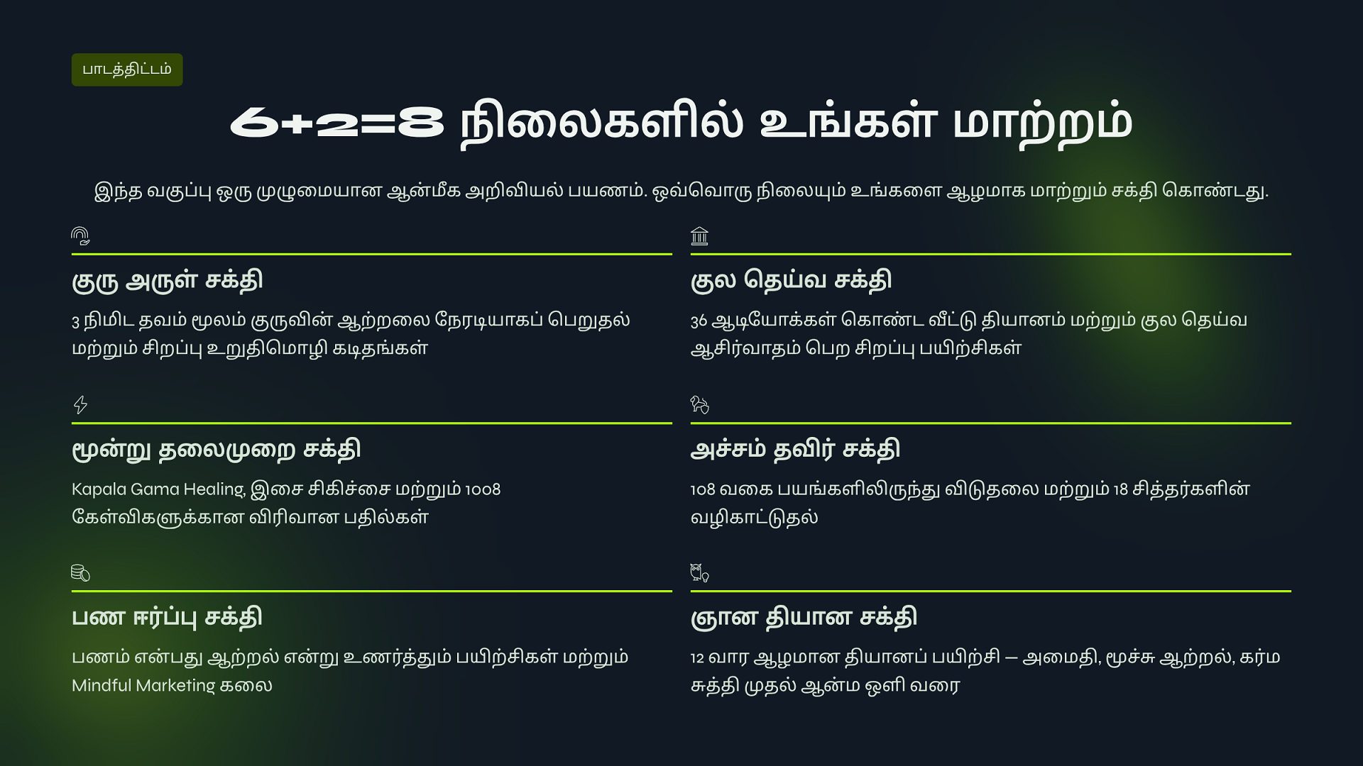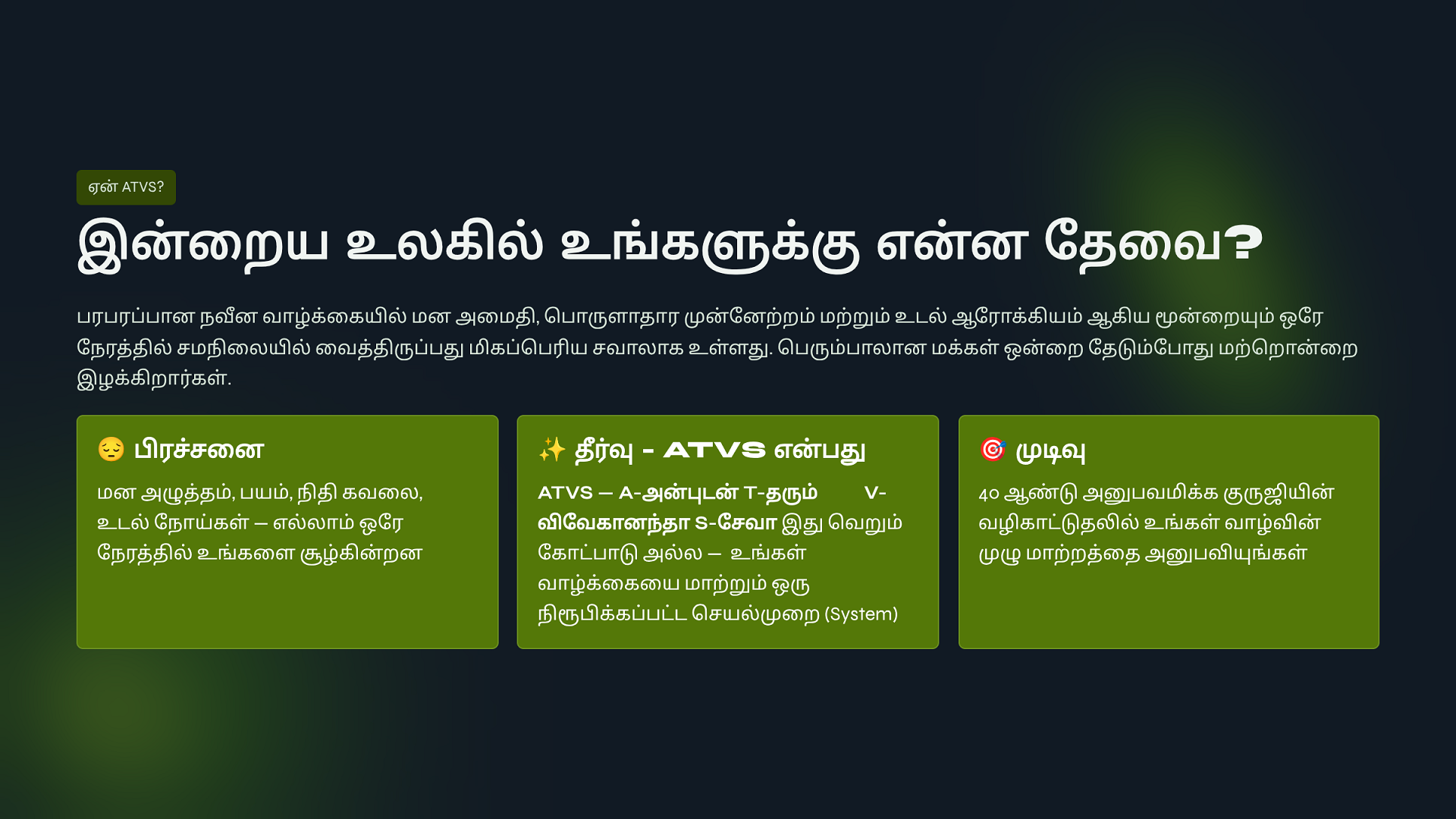 ATVS Community உறுப்பினராக சேர்ந்திருங்கள். உறுப்பினர் கட்டணம் ₹1000 + GST ₹180 = ₹1,180 உங்களுக்கு எங்களது ஆன்லைன் சேவை 1️⃣ குரு அருள் சக்தி, 2️⃣ குல தெய்வ சக்தி, 3️⃣ மூன்று தலைமுறை சக்தி, 4️⃣ அச்சம் தவிர் சக்தி, 5️⃣ பணம் ஈர்ப்பு சக்தி, 6️⃣ ஞான தியான சக்தி, 7️⃣ Atvs Bonus 1: eBooks - 21 - Day Life Clarity & Peace System 8️⃣ Atvs Bonus 2: eBooks - 21 - Spiritual Remides இதை நன்கு பயின்று மாயா & சாயா மங்கல சக்தி பைகள் தயாரித்து விற்பனை செய்து மாதம் 1,00,000 சம்பாதிக்கும் ஆன்மீக தொழில்முனைவோர் திட்டம் தருகிறோம்.